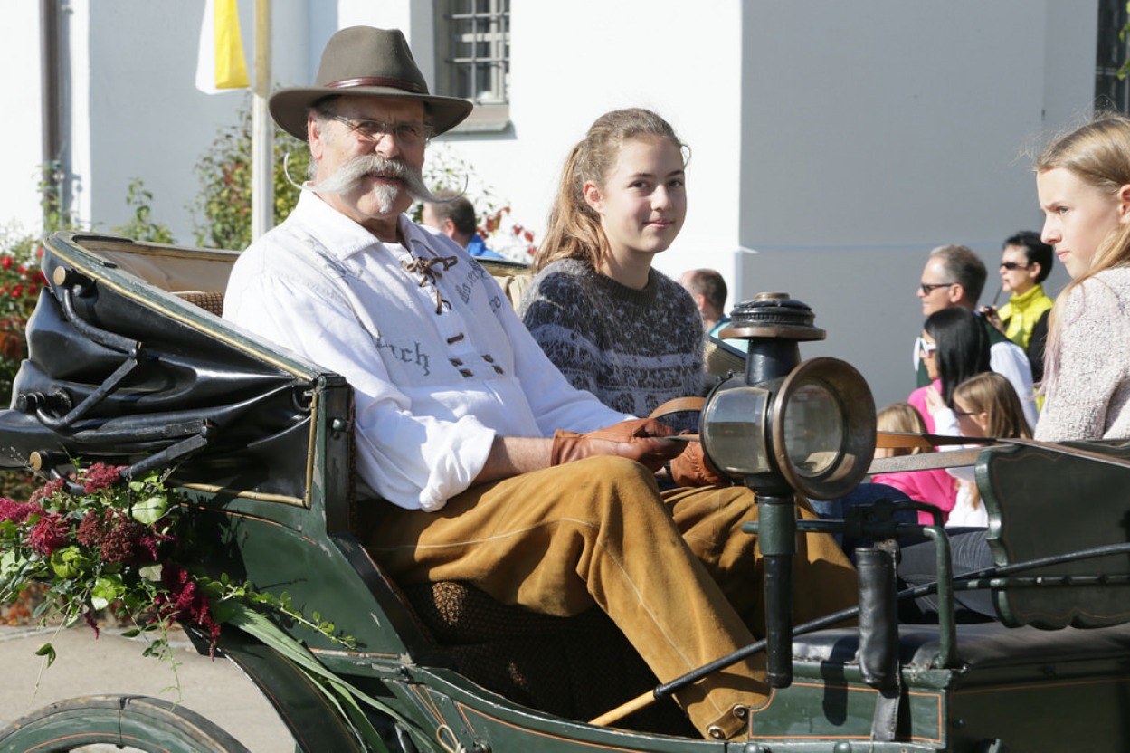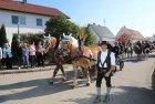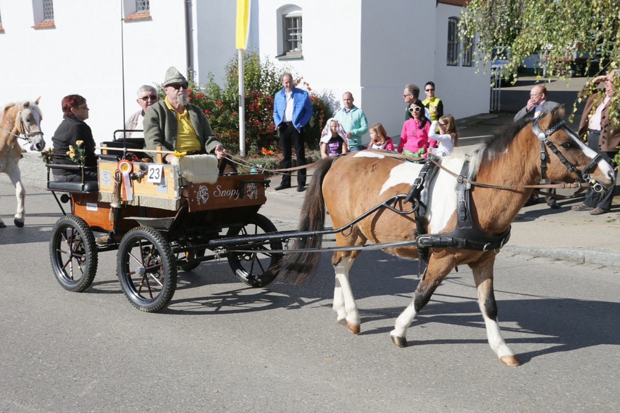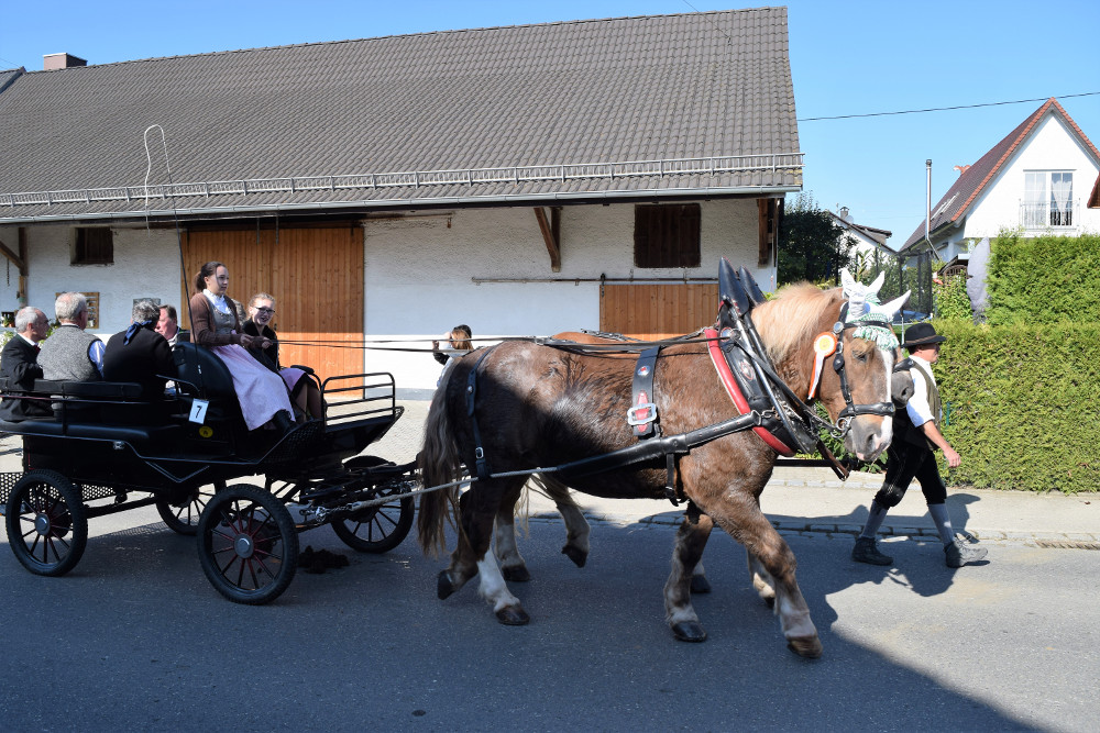 Die weiteste Anreise hatte Alfons Mesner aus Wildbadkreut (177 km). Er zog den Wagen mit der Erntekrone. Die Göggelmann Mädla aus Eggenhofen schlossen in ihren prächtigen Kleidern den Zug ab.