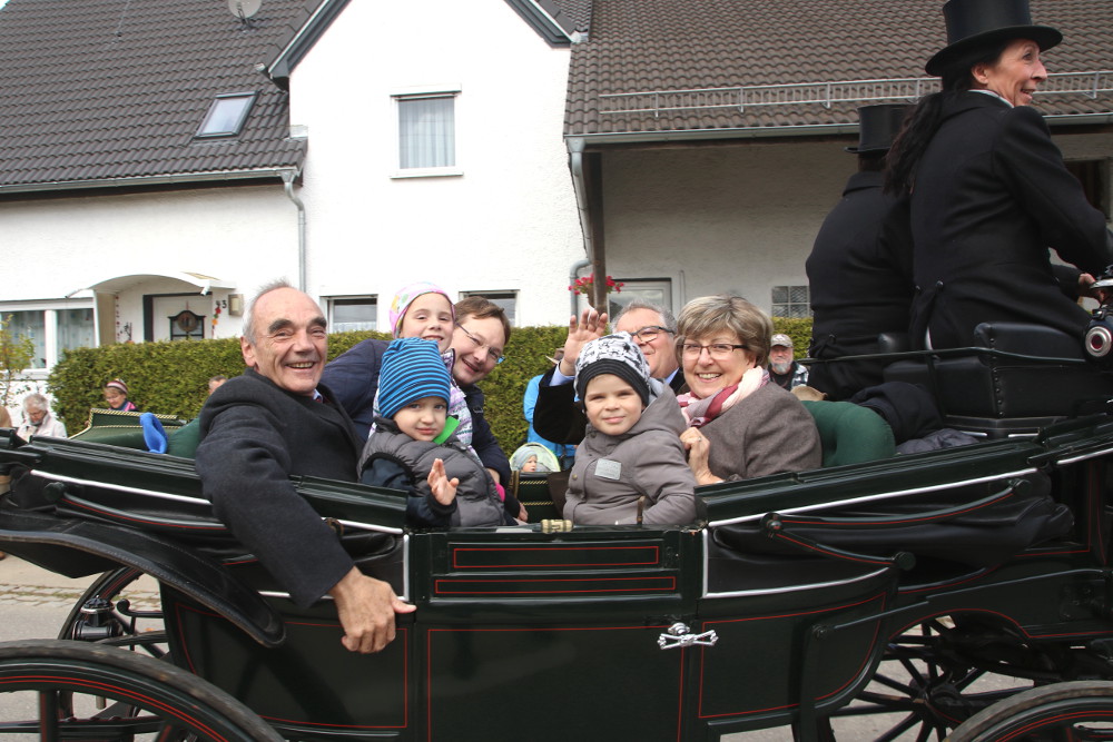 Als dann um 13.30 Uhr die ersten Klänge der Musikkapelle Röfingen zu hören waren ging´s los. Der Reit- und Fahrverein Jettingen führte den Zug an. In den Kutschen von Alban Wolf aus Bibertal Ettlishofen, Karl Aumann aus Zusamzell, Familie Rieß aus Unterknöringen und Matheus Grüner haben die angereisten Ehrengäste ihre Plätze gefunden.